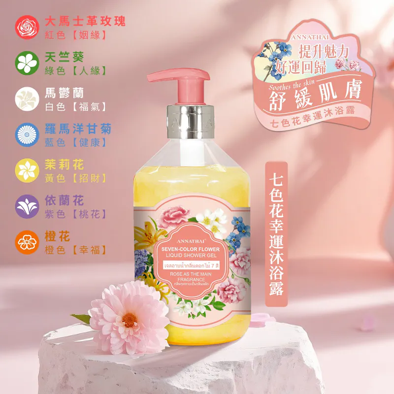 泰國 ANNATHAI 七色花幸運洗護組合 500ml 📦下單後需等1-2星期!! 💐 七色花幸運沐浴露 ✅ 核心功效:時來運轉、提升整體運氣、驅除頑固霉運 每次洗澡都是一次「轉運儀式」!七種顏色的花香精華融合,洗淨身體汙垢的同時,還能慢慢提亮自身氣場,就像給自己罩上一層「好運保護罩」。獨特香氣聞著超放鬆,洗完不僅皮膚滑溜溜,連心情都變得超好,霉氣仿佛隨著泡沫一起沖走~ 💐 七色花修護能量洗髮水 ✅ 核心功效:洗淨頭頂「晦氣」、消磁增運、提神醒腦 頭髮清爽,運氣才會「通暢」!這款洗髮水不僅能全方位呵護秀髮 —— 溫和清潔、泡沫細膩,洗完頭髮不毛躁、又亮又順,還藏著「消障礙」的小力量:幫你掃走不順心的小阻礙,洗完頭瞬間覺得頭腦清醒,智慧與活力都在線,容光煥發的樣子,好運自然願意靠近! 💐 七色花能量煥采身體乳 ✅ 核心功效:時來運轉、鬆弛身心、解穢除霉 洗完澡塗上,讓好運「鎖」住一整天!質地滋潤不黏膩,塗完皮膚軟嫩又有光澤,七色花的香味慢慢散發,不僅能淨化周圍空氣,還能持續增強自身氣場。無論是睡前塗讓睡眠更安穩,還是早上塗開啟元氣一天,都能悄悄為你積攢好運,轉運、添財、增姻緣統統幫你安排!